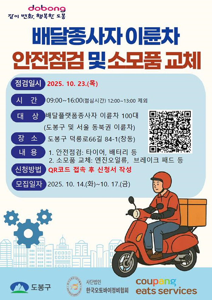 행사에는 쿠팡이츠서비스와 한국오토바이정비협회가 참여하며, 구에서는 장소제공과 안전용품 지원 등을, 쿠팡에서는 이륜차 소모품 교체 비용 등을 지원한다.