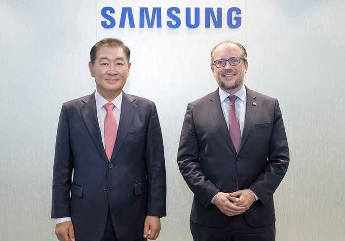 | ▲ 삼성전자 DX부문장 한종희 부회장(왼쪽)과 알렉산더 샬렌베르크 오스트리아 외교부장관이 기념촬영을 하고 있다. (사진제공=삼성전자) |