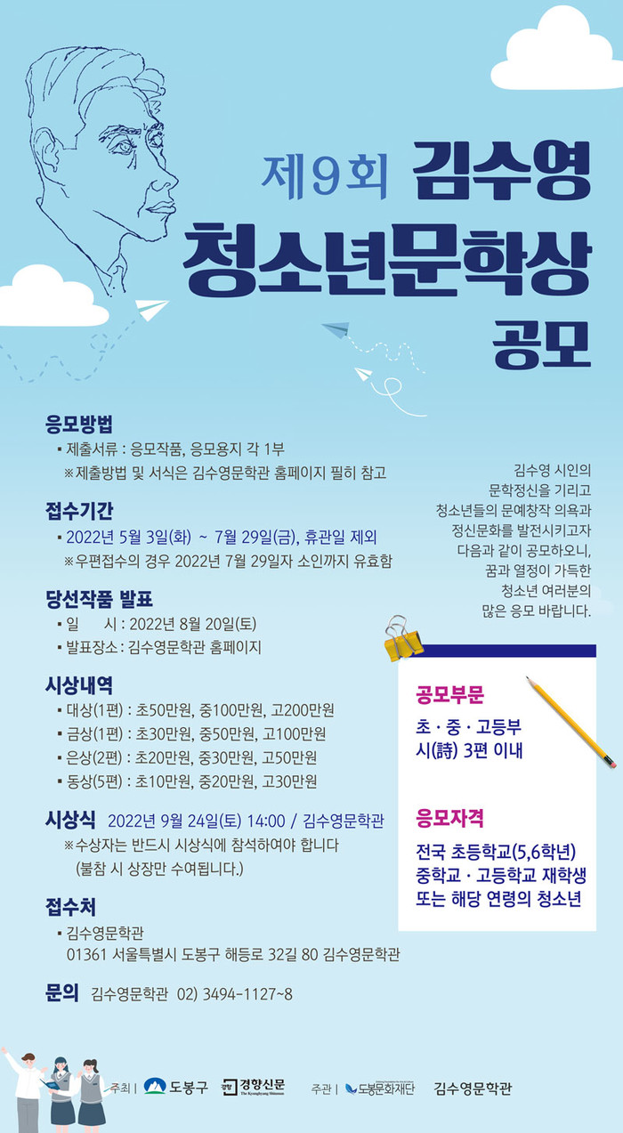 [시민일보 = 박준우 기자] 서울 도봉구(구청장 이동진)가 오는 5월3일부터 7월29일까지 '제9회 김수영 청소년문학상'을 공모한다고 25일 밝혔다.