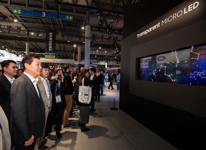 | ▲ 삼성전자 DX부문장 한종희 부회장과 임직원들이 ISE 2024 삼성 전시장에서 '투명 마이크로 LED'를 살펴보고 있는 모습.(사진=삼성전자 제공) |