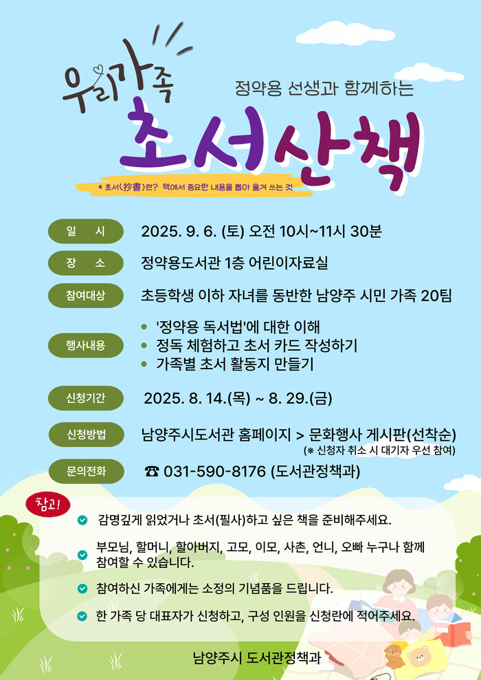주요 내용은 △정약용 독서법 이해 △정독 체험과 초서 카드 작성 △가족별 초서 활동지 만들기 체험으로 진행된다. 초등학생 이하 자녀를 동반한 관내 거주 가족이면 누구나 참여 가능하며, 참가 가족에게는 기념품이 제공된다.