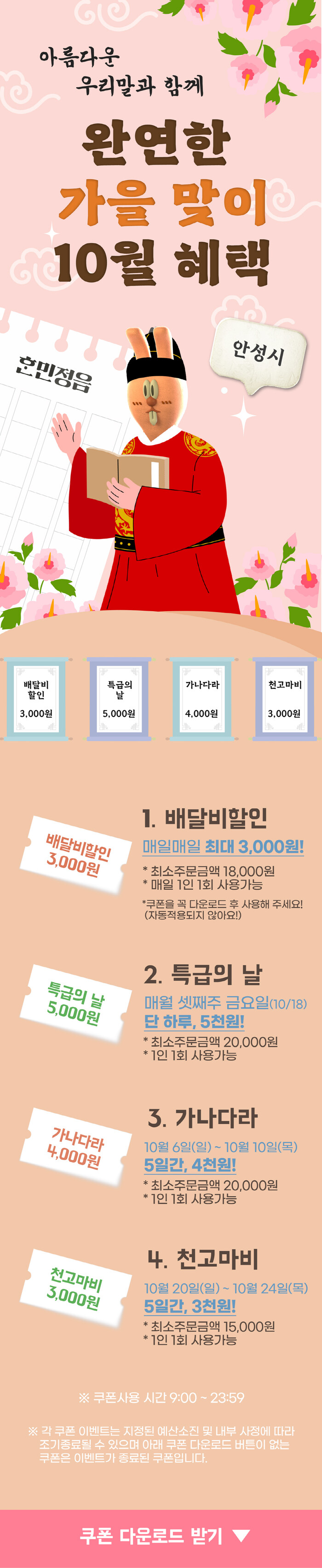 주요 이벤트 내용은 배달비 할인 3000원, 특급의 날(셋째주 금요일) 할인 5000원, 주말 할인 3000원, 천고마비 할인 3000원 할인 이벤트를 진행한다.