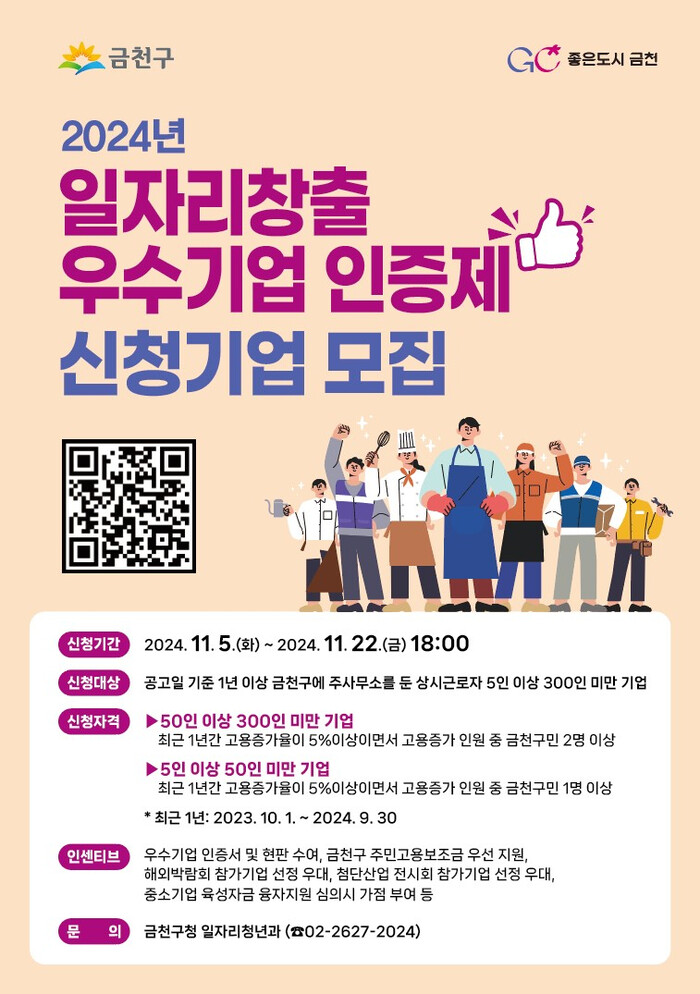 [시민일보 = 여영준 기자] 금천구(구청장 유성훈)는 ‘2024년 일자리창출 우수기업 인증제’ 참여기업을 오는 22일까지 모집한다고 밝혔다.