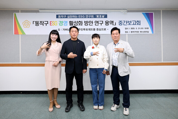 [시민일보 = 여영준 기자] 서울 동작구의회(의장 정재천) 의원 연구단체 ‘동작구 실천하는 ESG 연구회, 實里會’가 지난 21일 구의회 제1소회의실에서 ‘동작구 ESG 경영 활성화 방안 연구’ 용역 중간보고회를 개최했다.