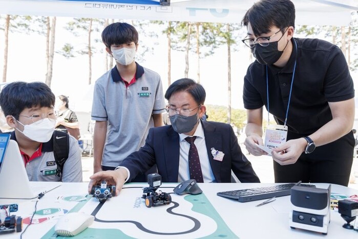 | ▲ 지난해 열린 마포진로박람회 체험부스에서 박강수 구청장(가운데)이 학생들과 로봇코딩체험을 하고 있다. (사진=마포구청 제공) |