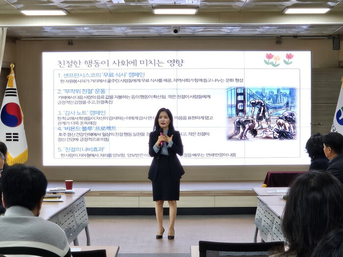 | ▲ 해남교육지원청, 지난 4일 직원 90여 명 대상 공감커뮤니케이션 대표 박진영 강사의 친절 교육 / 해남교육지원청 제공 |