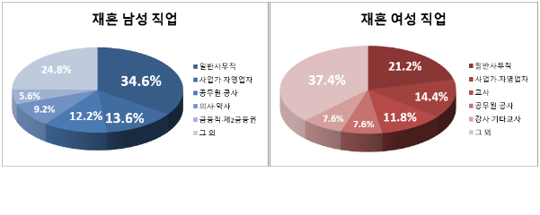 재혼남녀의 직업은 ‘일반 사무직’(남 34.6%, 여 21.2%)이 1위, ‘사업가·자영업자’(남 13.6%, 여 14.4%)가 2위였고, 이어 남성은 ‘공무원·공사’(12.2%), ‘의사·약사’(9.2%), 여성은 ‘교사’(11.8%), ‘공무원·공사’(7.6%) 순이었다.
