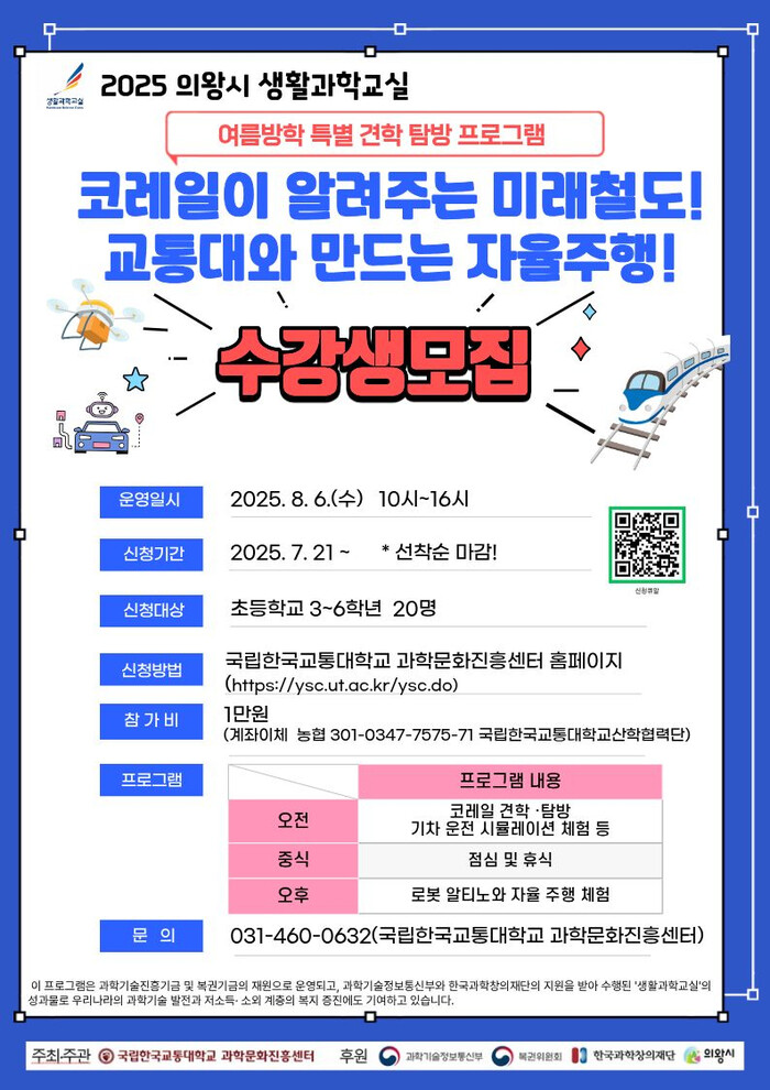 참가 신청은 다음 달 1일까지 선착순(초등학교 3~6학년 / 20명)으로 국립한국교통대학교 과학문화진흥센터 홈페이지에서 진행된다.
