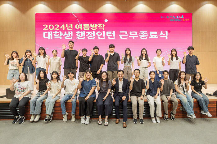 | ▲ ‘2024 여름방학 대학생 행정인턴 근무종료식’에 참석한 이기재 구청장이 학생들과 기념 촬영하고 있다. (사진=양천구청 제공) |