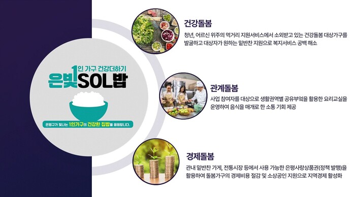 ‘은빛SOL밥’은 ‘은'평구의 ’빛'나는 ‘솔’로(SOLO) 1인가구에 지원하는 건강한 집’밥’을 의미하는 은평구 특화사업으로, 불규칙한 식습관 등 건강 돌봄이 필요한 1인가구에 정기적인 먹거리를 지원하고, 생활권역별 공유주방을 활용한 건강요리교실을 운영한다.
