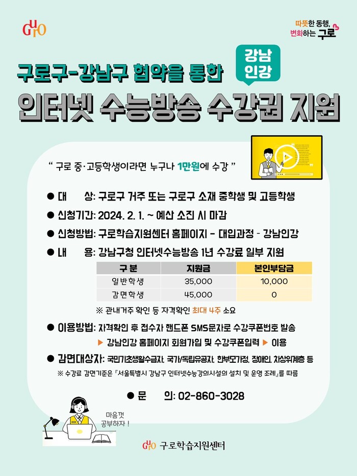 [시민일보 = 이대우 기자] 서울 구로구가 사교육비 절감 및 학습동기 부여를 위해 올해도 ‘강남구청 인터넷 수능방송’ 수강권 구매비용을 지원한다.