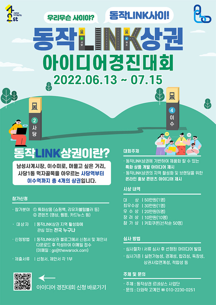 우선 구는 우수한 상권 활성화 콘텐츠 아이디어를 발굴하기 위해 13일~7월15일 ‘동작LINK상권 아이디어경진대회’를 개최한다. 이번 대회 주제는 동작LINK상권 관련 ▲쇼핑백, 리유저블텀블러 등 특화 상품 개발 ▲지역 활성화 및 브랜딩 위한 온라인 홍보 콘텐츠 등의 아이디어다.