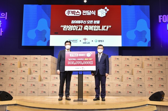 중랑구는 최근 동국제약과 세계로교회로부터 샴푸, 마시는 콜라겐 등으로 구성된 효(孝)박스 1500상자(약 3억8000만원 상당)를 전달받았다. 구는 이 효박스를 지역내 저소득층 홀몸노인들에게 전달할 예정이다. 사진은 전달식에서 류경기 구청장(오른쪽)이 기념촬영을 하는 모습.(사진제공=중랑구청)