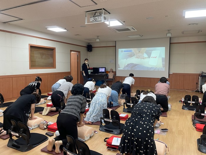 서울 중랑구가 이달 말까지 보건소 전직원을 대상으로 자동심장충격기(AED) 사용법과 심폐소생술 교육을 실시한다. 이 교육은 구민을 직접 대면하고 있는 직원들의 응급상황 대처능력을 향상시키기 위한 것으로 총 8회에 걸쳐 기초 이론지식부터 응급상황 대처요령 등으로 구성됐다. 사진은 2일 보건소 직원들이 심폐소생술 교육을 받고 있는 모습. (사진제공=중랑구청)