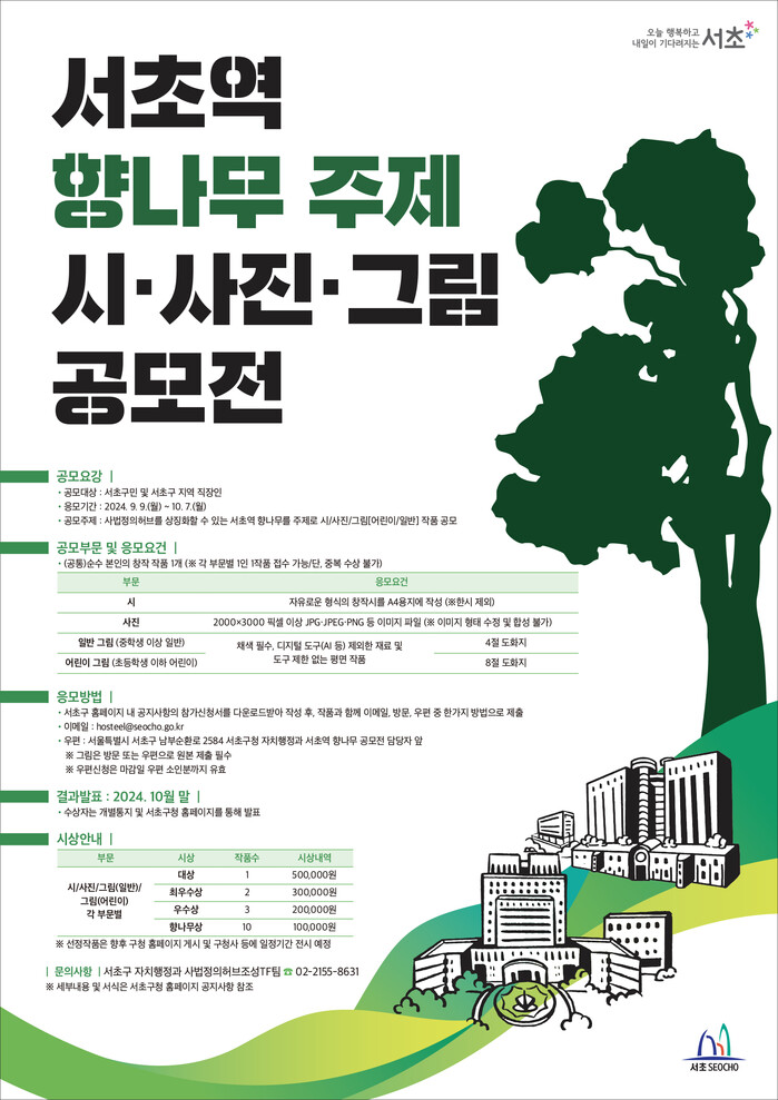 11일 구에 따르면 '향나무 작품 공모전'은 ▲시(자유형식, 한시 제외) ▲사진(2000×3000 픽셀 이상의 이미지 파일) ▲그림(초등생 이하 어린이·중학생 이상 일반) 부문으로 진행된다. 참가자들은 서초역 향나무를 자유롭게 작품에 표현하면 된다.