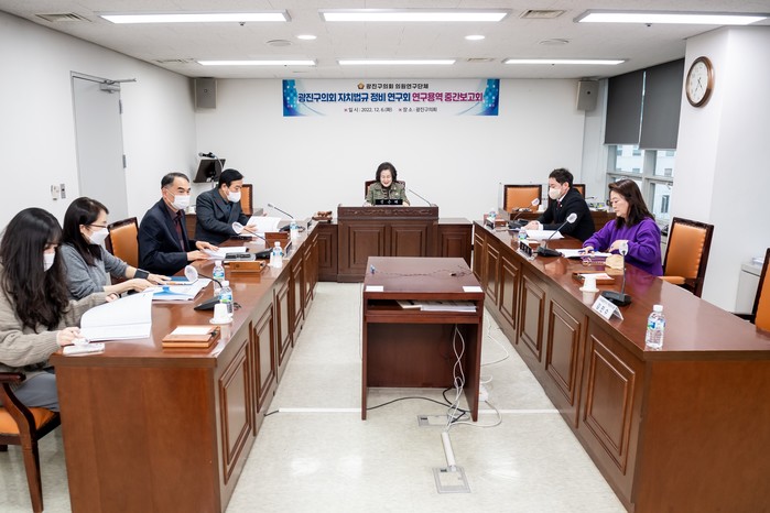 [시민일보 = 여영준 기자] 서울 광진구의회 의원연구단체인 ‘자치법규정비연구회’가 최근 의회 기획행정위원회의실에서 ‘광진구의회 정비 조례 발굴 및 정비방안 마련 연구용역 중간보고회’를 개최했다.
