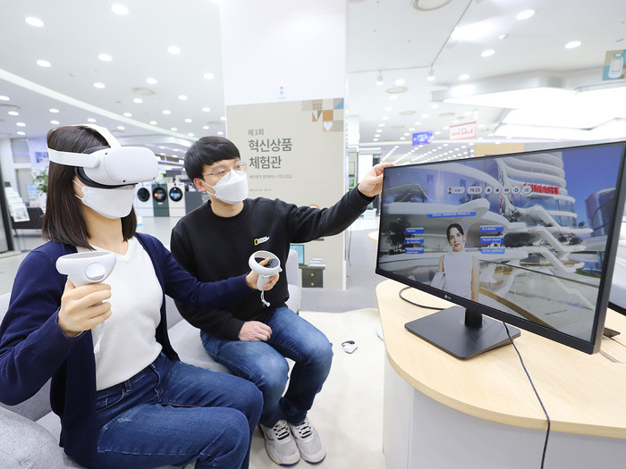 | ▲ 롯데하이마트 월드타워점에서 열리는 ‘제3회 혁신상품 체험관’에서 모델들이 VR기기를 활용해 가상의 하이마트 매장을 체험하고 있다. (사진제공=롯데하이마트) |