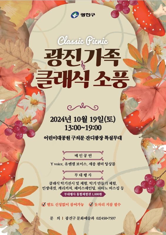 [시민일보 = 여영준 기자] 광진구(구청장 김경호)가 오는 19일, 어린이대공원 구의문 잔디광장 특설무대에서 ‘2024 광진가족 클래식 소풍’을 개최한다.