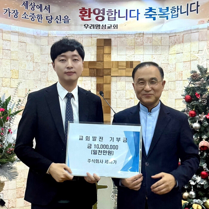 [시민일보 = 김민혜 기자] 벤처기업 주식회사 세이가(대표 이경도)는 지난 29일 우리명성교회에 기부금 일천만원을 전달했다고 밝혔다.