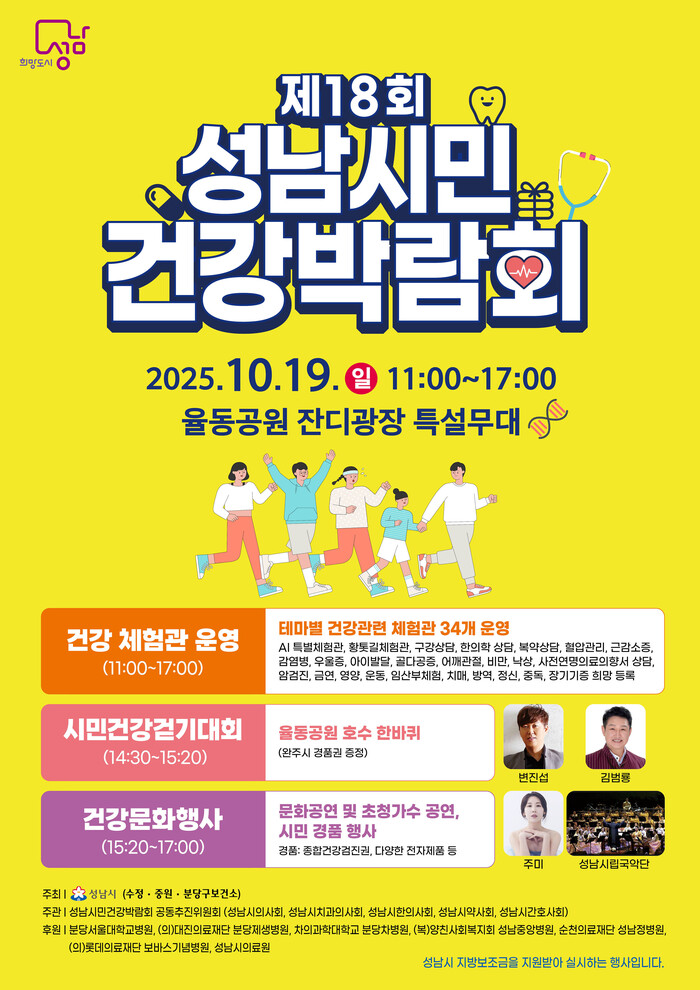 [성남=오왕석 기자] ‘제18회 성남시민 건강박람회’가 오는 10월 19일 오전 11시~오후 5시 율동공원 잔디광장에서 열린다.