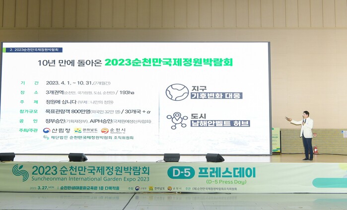 [순천=이문석 기자]기후위기·지방위기 시대 미래도시의 표준을 제시할 2023순천만국제정원박람회 개막이 5일 앞으로 성큼 다가왔다.