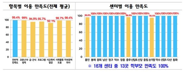 구에 따르면 응답자의 99.4%가 만족한다고 답했으며 전체 16개 센터 중 13곳에서 100%의 만족도를 보였다.