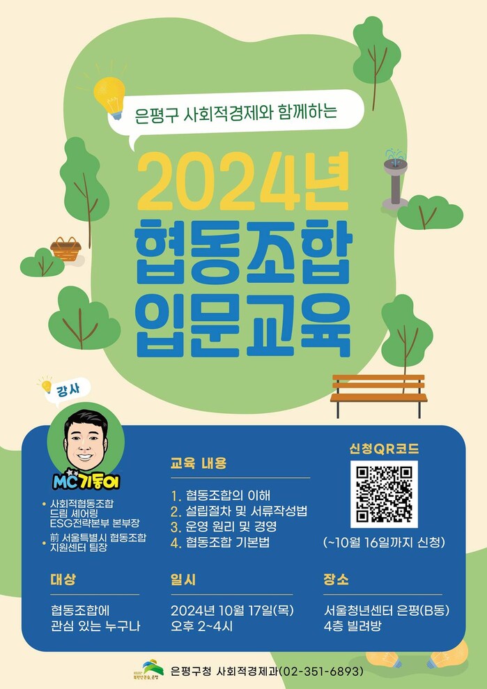 [시민일보 = 이대우 기자] 은평구(구청장 김미경)는 17일 협동조합 초심자를 위한 ‘2024년 협동조합 입문교육’을 실시한다고 밝혔다.