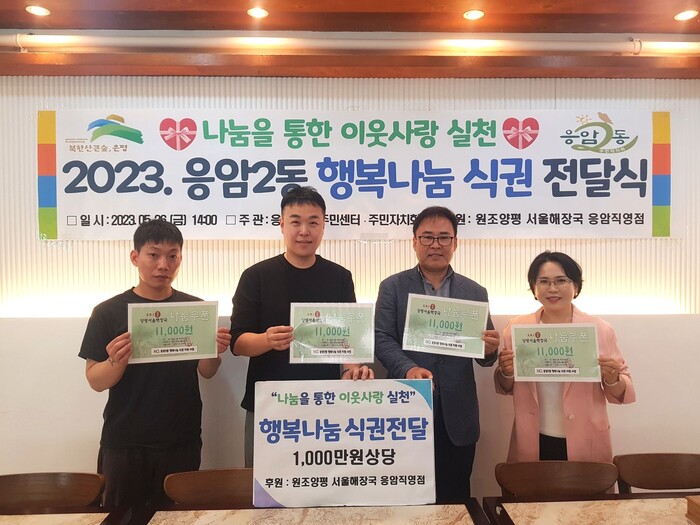 응암2동은 기부받은 나눔 식권을 올해 연말까지 저소득계층을 위해 ‘한끼 식사나눔’ 행사를 열어 지원할 계획이다. 건강과 돌봄이 필요한 1인가구를 적극 발굴해 지원할 예정이다.