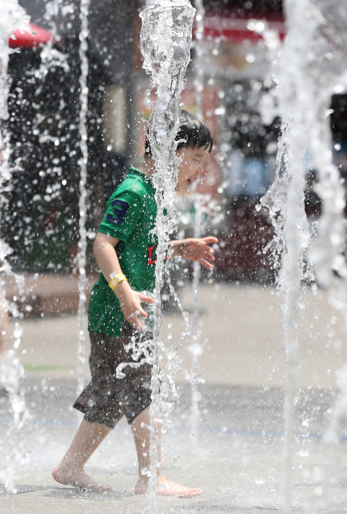 19일 대구의 낮 기온이 30도를 웃돈 가운데 대구 달서구 이월드에서 방문객들이 바닥분수로 더위를 식히고 있다.