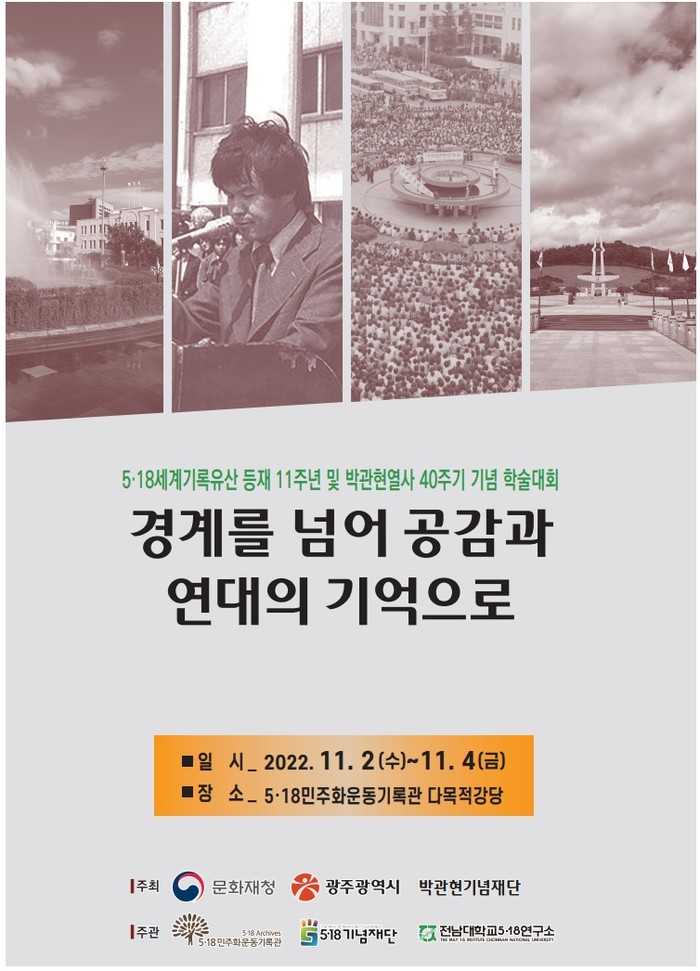 ‘경계를 넘어 공감과 연대의 기억으로’라는 주제로 열리는 이번 학술대회는 손호철 서강대학교 명예교수 초청특강을 비롯해 들불야학 및 민족민주대성회, 5‧18언론탄압, 광주YWCA, 미국 일본기록 등 15개의 주제로 진행된다.