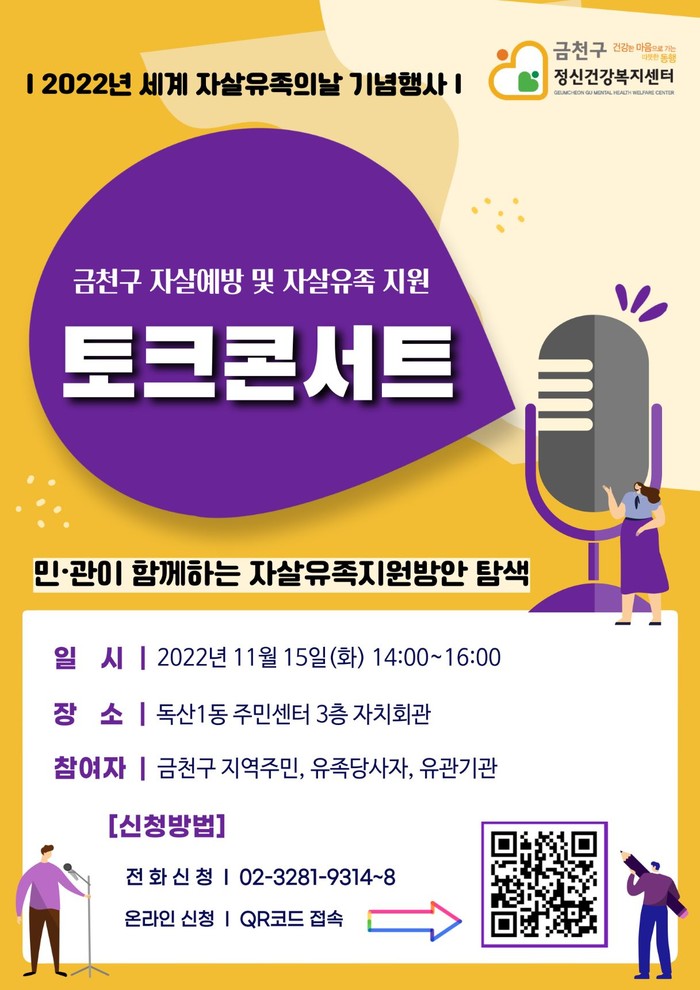 토크 콘서트에 참여하고 싶은 사람은 오는 8일까지 금천구정신건강복지센터로 전화하거나, 행사 홍보물 하단의 QR코드 접속을 통해 온라인으로 신청하면 된다.