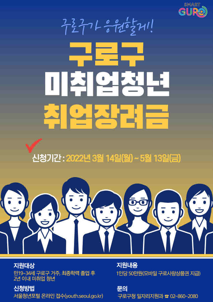 [시민일보 = 박준우 기자] 서울 구로구(구청장 이성)가 코로나19로 어려움을 겪는 미취업 청년을 위해 오는 14일부터 5월13일까지 ‘미취업 청년 취업장려금’ 신청을 받는다고 10일 밝혔다.