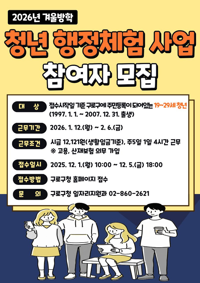 [시민일보 = 박소진 기자] 서울 구로구(구청장 장인홍)는 2026년 겨울방학을 맞이해 청년 행정체험 사업 참여자를 모집한다.