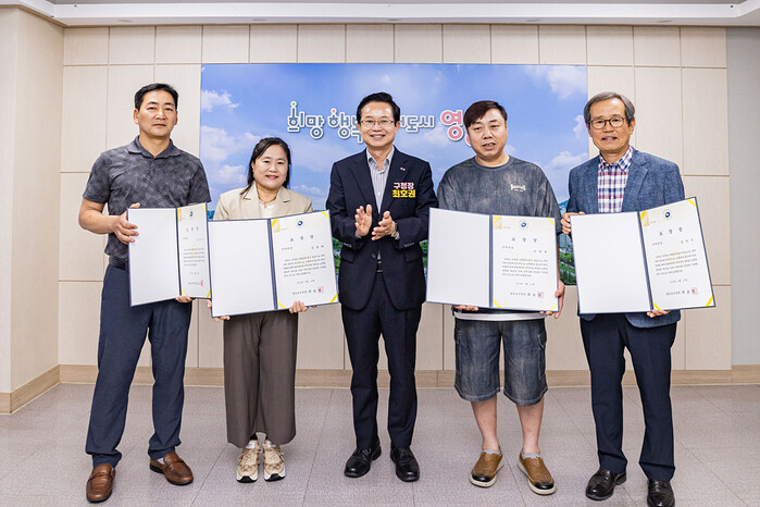 영등포구가 26일 구청 본관 제1회의실에서 지역안전 유공자 표창 수여식을 진행했다. 사진은 표창 수여식에 참석한 최호권 구청장(가운데)이 유공자들과 기념촬영을 하고 있는 모습. (사진=영등포구청 제공)