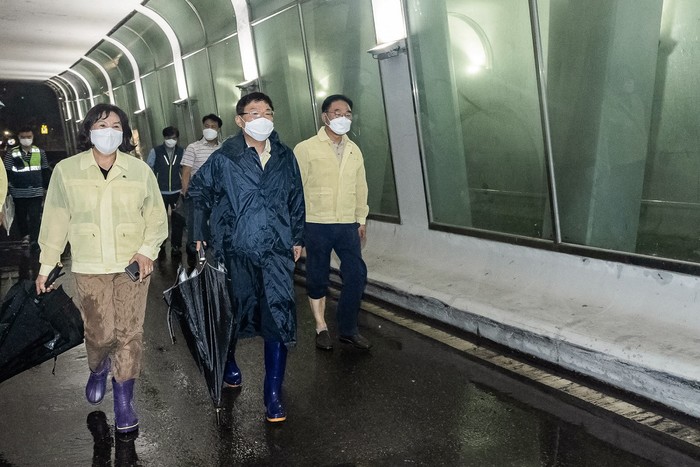 김경호 서울 광진구청장이 서울 등 중부지방에 기록적인 폭우가 내린 지난 8일 오후 10시를 기해 3단계 비상근무를 발령하고 수해 취약 지역 긴급 현장 점검에 나섰다. 지역 풍수해 상황을 보고받은 김 구청장은 중랑천 진출입로 통제와 동별 피해 예방에 철저한 대응을 당부하고, 곧바로 수해 취약 지역을 방문해 현장을 점검했다. 사진은 폭우 속 심야 현장점검(자양나들목)에 나선 김 구청장(가운데)의 모습. (사진제공=광진구청)