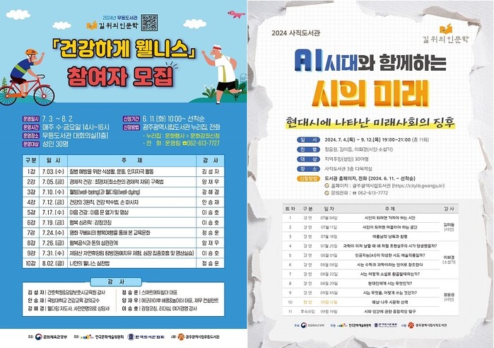 [광주=정찬남 기자] 광주광역시 무등·사직도서관은 7월부터 ‘웰니스와 시’를 주제로 독서와 강연, 탐방이 함께하는 ‘2024 길 위의 인문학 프로그램’을 10차례 운영한다.