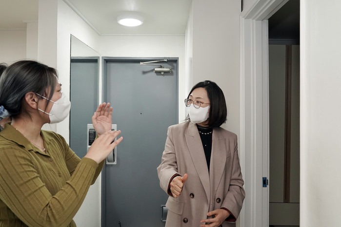 | ▲ 여성 1인 가구 쉐어하우스를 방문한 은시장 시설을 둘러보는 중. |
