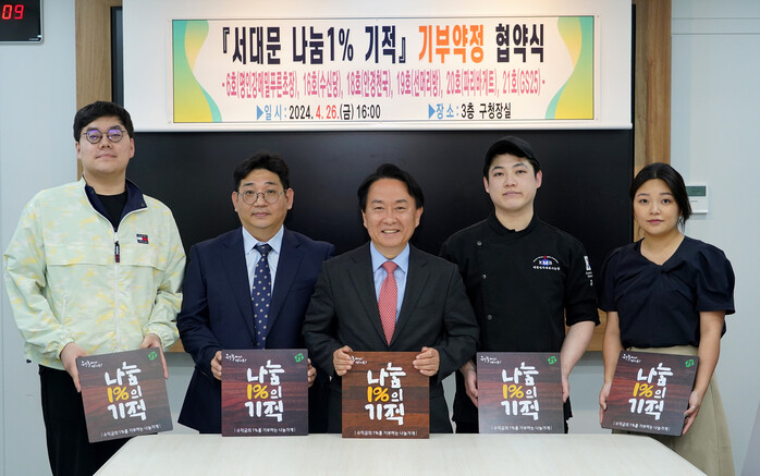 [시민일보 = 변은선 기자] 서울 서대문구(구청장 이성헌)는 최근 ▲6호점 명인강메밀 푸른초장(충현동) ▲16호점 수신당(남가좌1동) ▲18호점 안경천국명지대점(남가좌2동) ▲19호점 선머리방(홍은동) ▲20호점 파리바게트 서대문구청점(홍은동) ▲21호점 GS25서대문구청점(연희동)과 ‘서대문 나눔1%의 기적’ 공동협약을 체결했다고 2일 밝혔다.