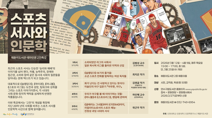 스포츠 서사에 관심이 있는 성인은 누구나 참여할 수 있으며, 신청은 27일(금) 오후 2시부터 연수구립도서관 누리집에서 선착순으로 할 수 있다.
