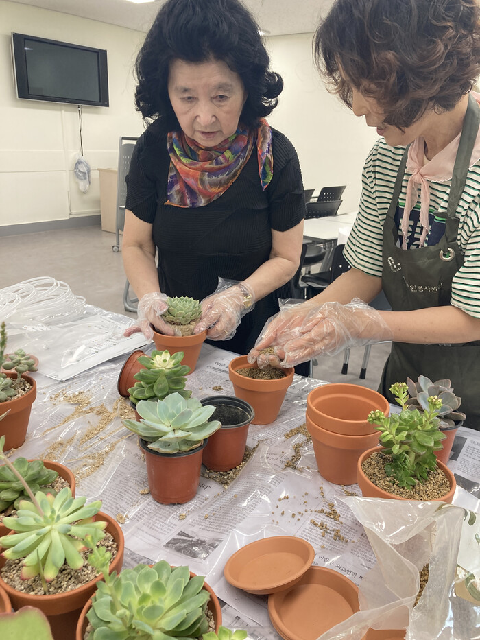 자원봉사 활동가들과 동주민센터 직원들이 반려식물 키트 재료와 수제 수세미, 손편지 등을 준비하고 어르신들과 함께 화분을 꾸미며 소통하는 시간을 가졌다.