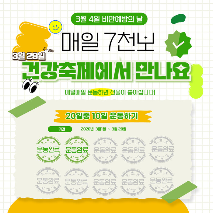 [인천=문찬식 기자] 인천 연수구(구청장 이재호)는 구민의 일상 속 걷기 실천을 독려하기 위해 ‘2026년 비만예방의 날 매일 걷기 운동 스탬프 챌린지’를 3 20일까지 운영한다.