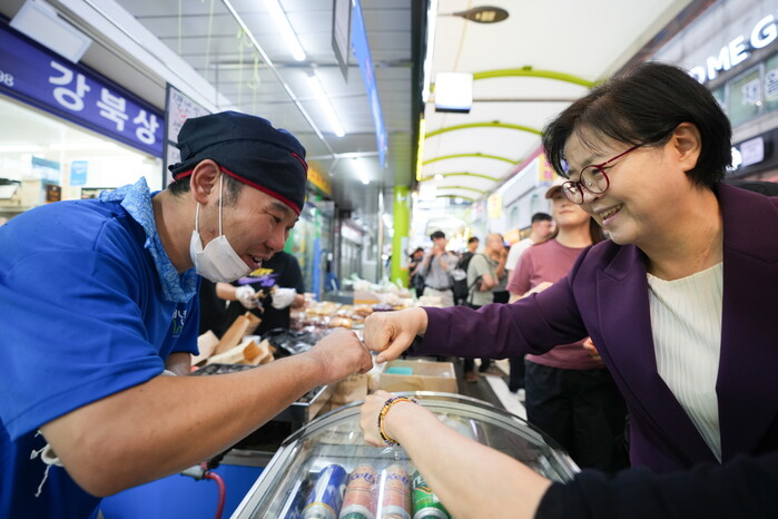 | ▲ '강북맥맥축제'에 참석한 이순희 구청장과 전통시장 상인이 인사하고 있다. (사진=강북구청 제공) |