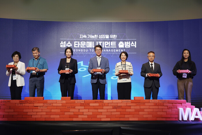 성동구(구청장 정원오)가 최근 성수동 ‘언더스탠드에비뉴’에서 ‘성수 타운매니지먼트 출범식’을 개최했다. 이번 출범식에는 성수동을 대표하는 50여개 기업과 주민 등 200여명이 참석했다. 사진은 정원오 구청장(가운데)이 기업 대표들과 기념 촬영을 하는 모습. (사진=성동구청 제공)