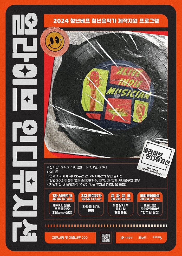 또한 3∼5월 진행될 ‘얼라이브 인디뮤지션’ 지원 기간 내에 음반을 제작할 수 있는 역량이 있어야 한다.