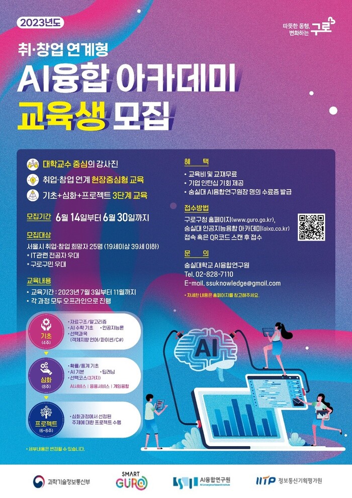 수강을 원하는 이는 이달 30일까지 숭실대학교 인공지능융합 아카데미 홈페이지에서 신청하면 된다. 자세한 사항은 구청 일자리지원과 또는 숭실대 AI융합연구원에 문의하거나 홈페이지에서 확인할 수 있다.