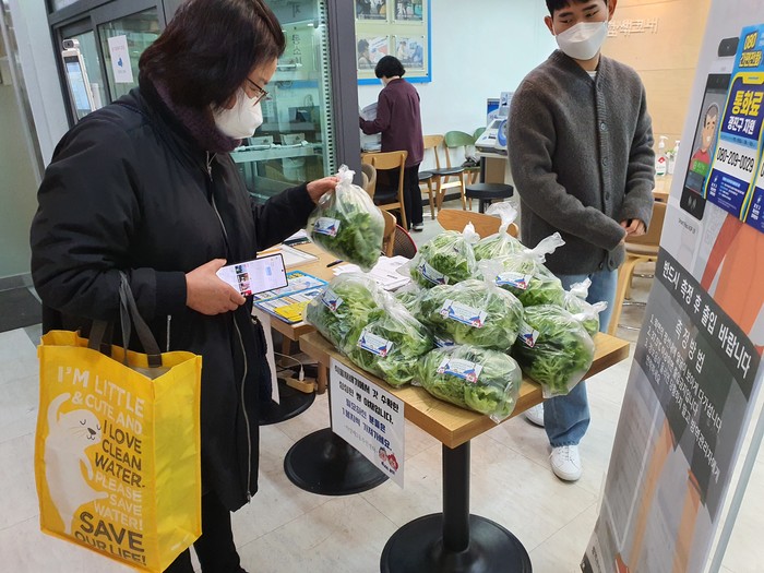 서울 광진구 자양2동 주민센터는 최근 민원실 실내 스마트 텃밭에서 재배한 유기농 쌈채소를 당일 방문한 구민들과 함께 나누고자 주민센터 내 자율 배부대를 설치했다. 사진은 이날 방문한 구민이 쌈채소를 가져가는 모습. (사진제공=광진구청)