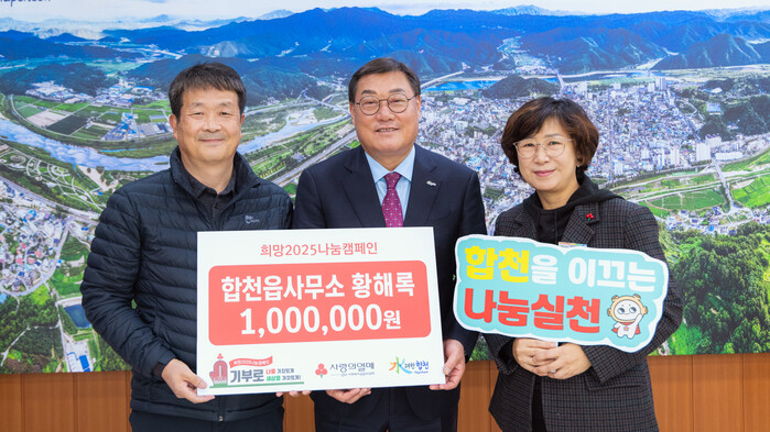이번에 전달받은 성금은 기탁자의 뜻에 따라 합천읍 관내 저소득 가정과 대병면의 1가구에 전달할 예정이다.