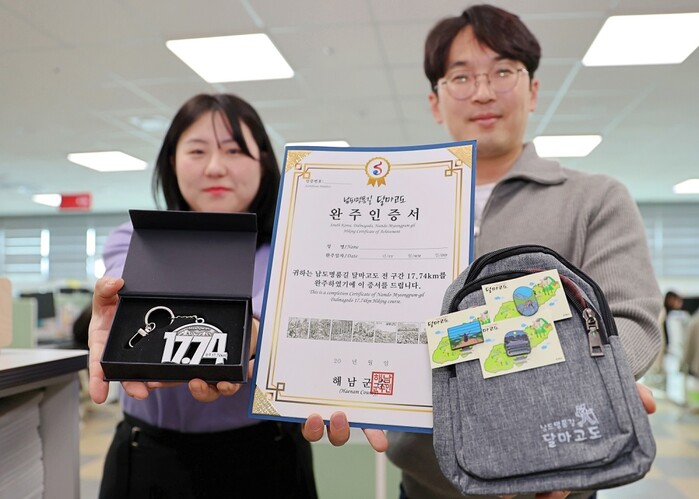 [해남=정찬남 기자] 새해를 맞아 해남 달마고도에 걷기 여행객들이 이어지고 있는 가운데 전남 해남군이 완주 기념품을 새롭게 선보이고 있다.