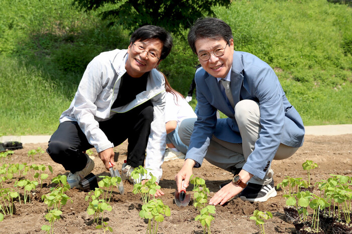 | ▲ 친환경 작물 케냐프를 활용한 그린카본 시범구역 조성 식재행사에 동참한 정원오 구청장(오른쪽)이 주민과 함께 케냐프를 심고 있다. (사진=성동구청 제공) |