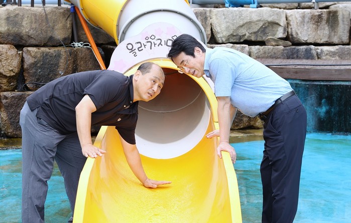 | ▲ 강진원 강진군수(오른 쪽)가 오는 23일 개장을 앞 둔 관내 물놀이장 시설을 점검하고 있다. / 사진=강진군 제공 |